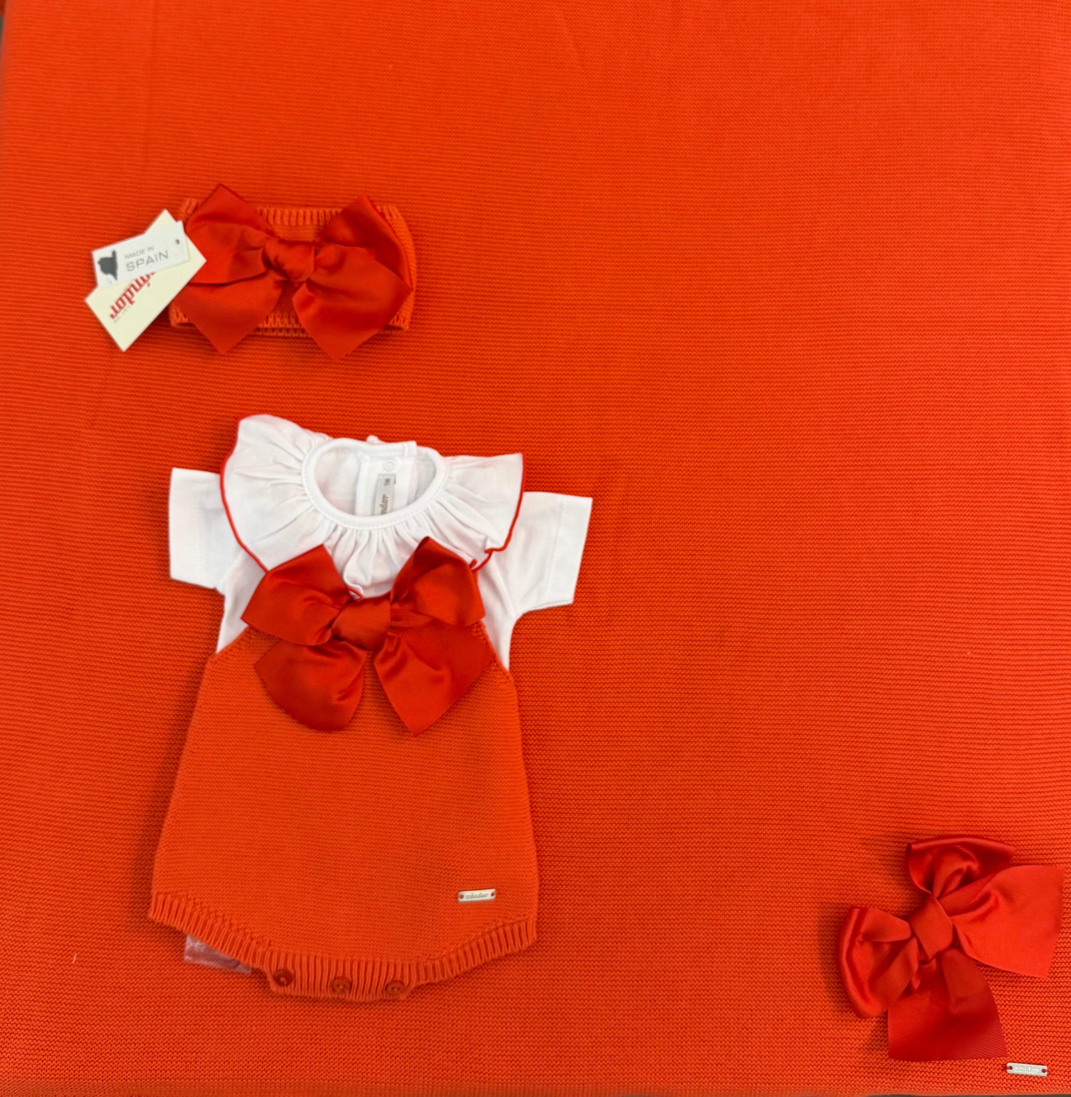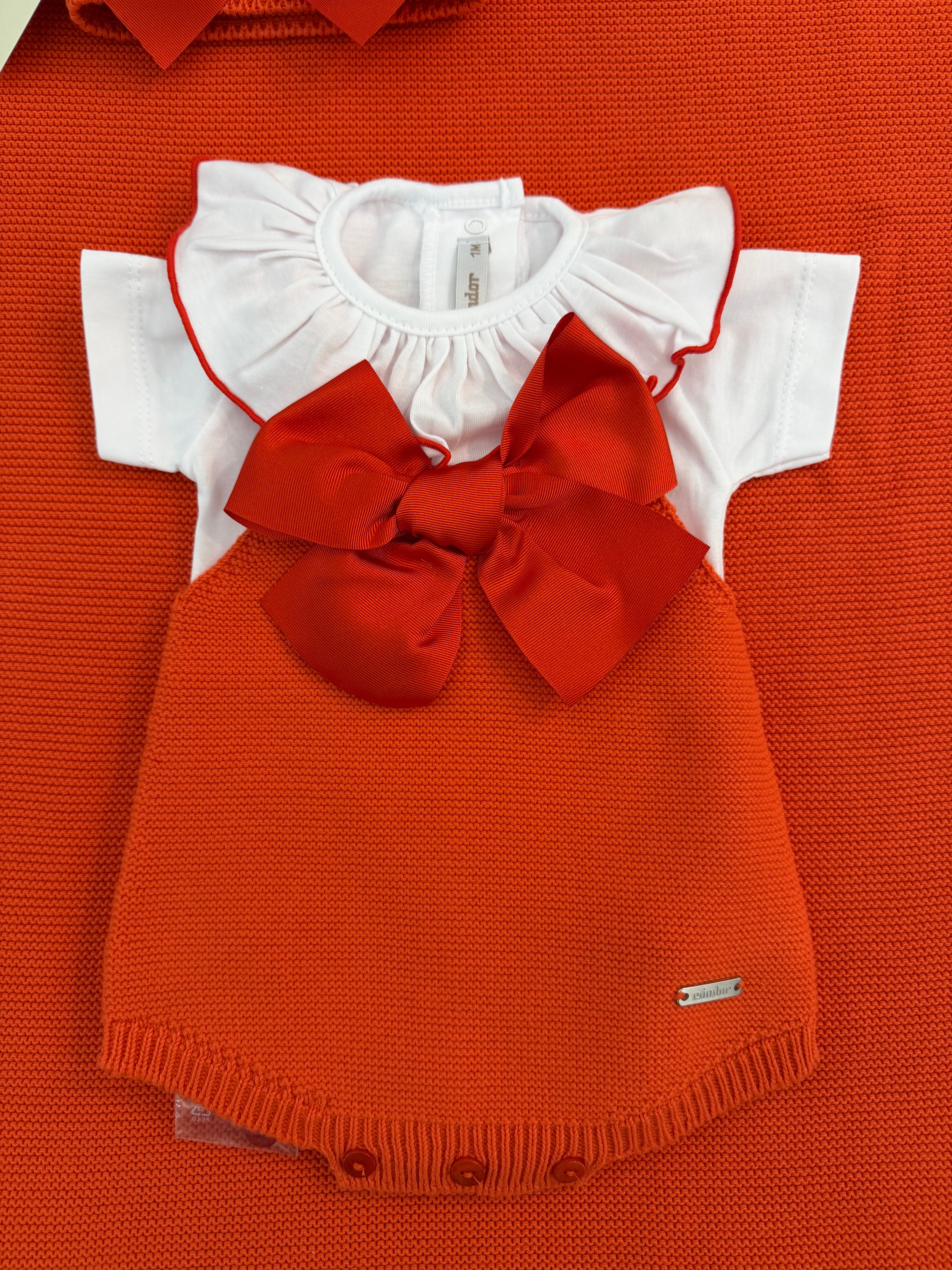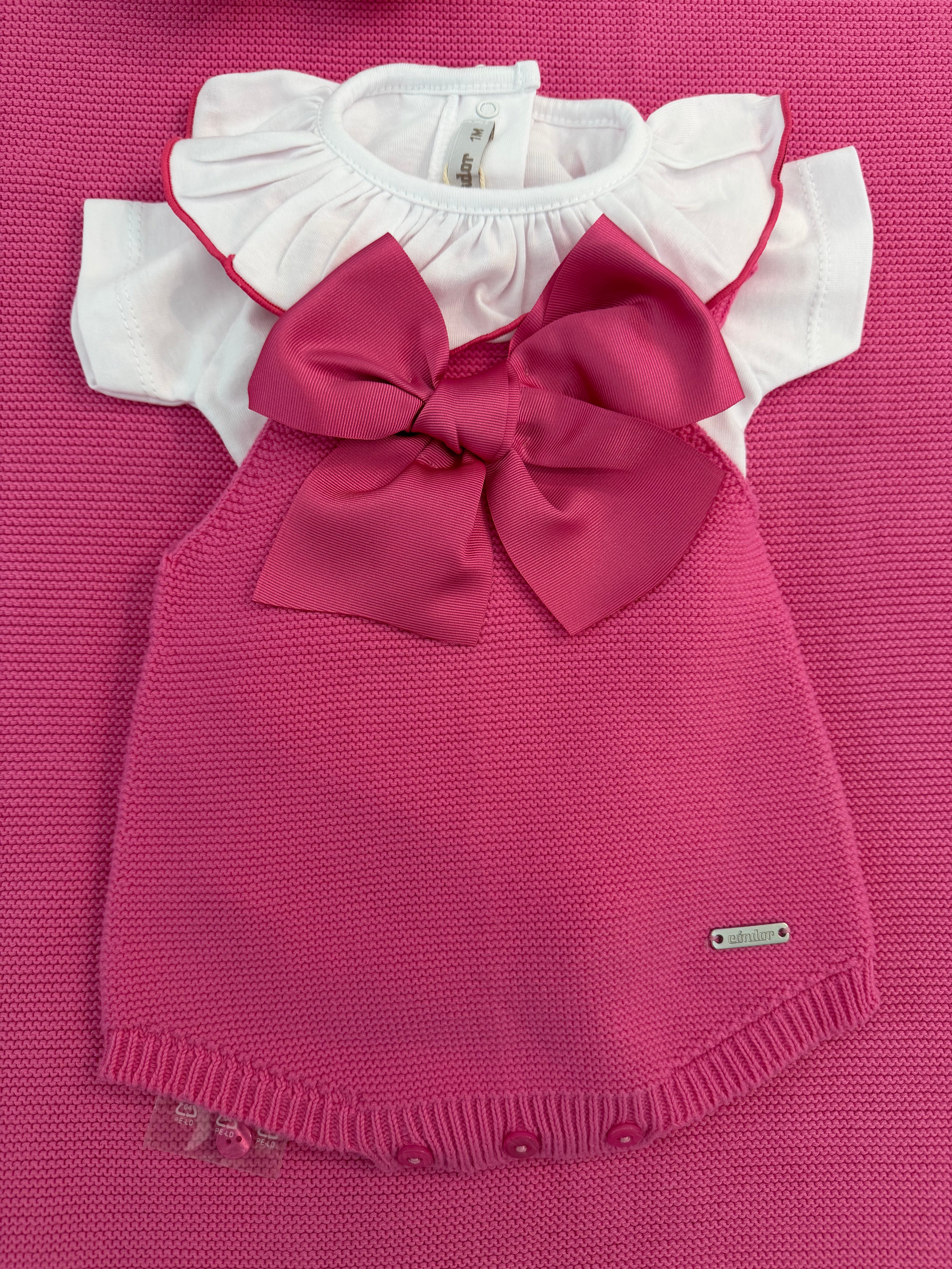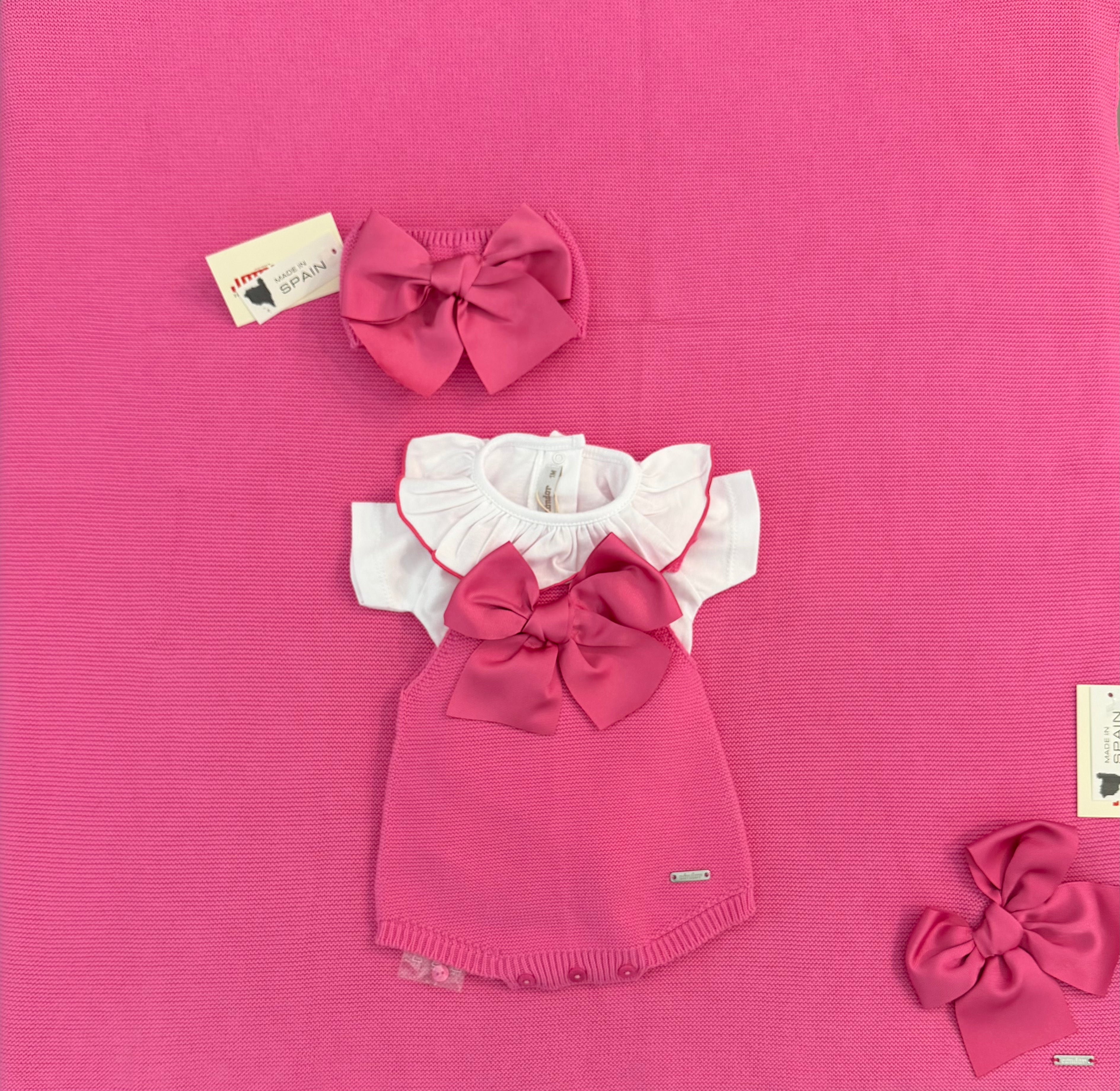 Completo 2pz pagliaccetto in filo con fiocco grande e body m/corta con colletto